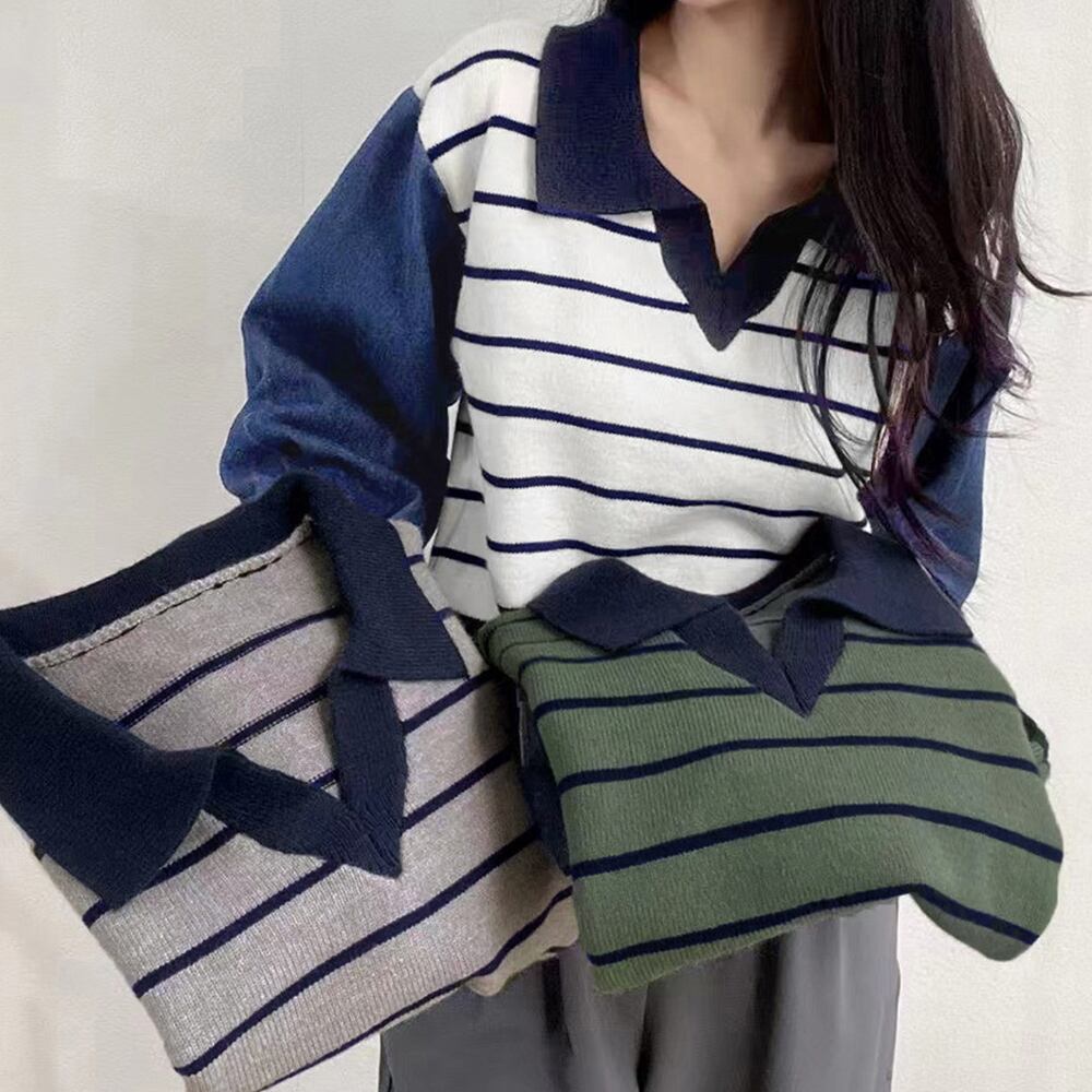 ポロカラーニットセーター ボーダー 秋冬