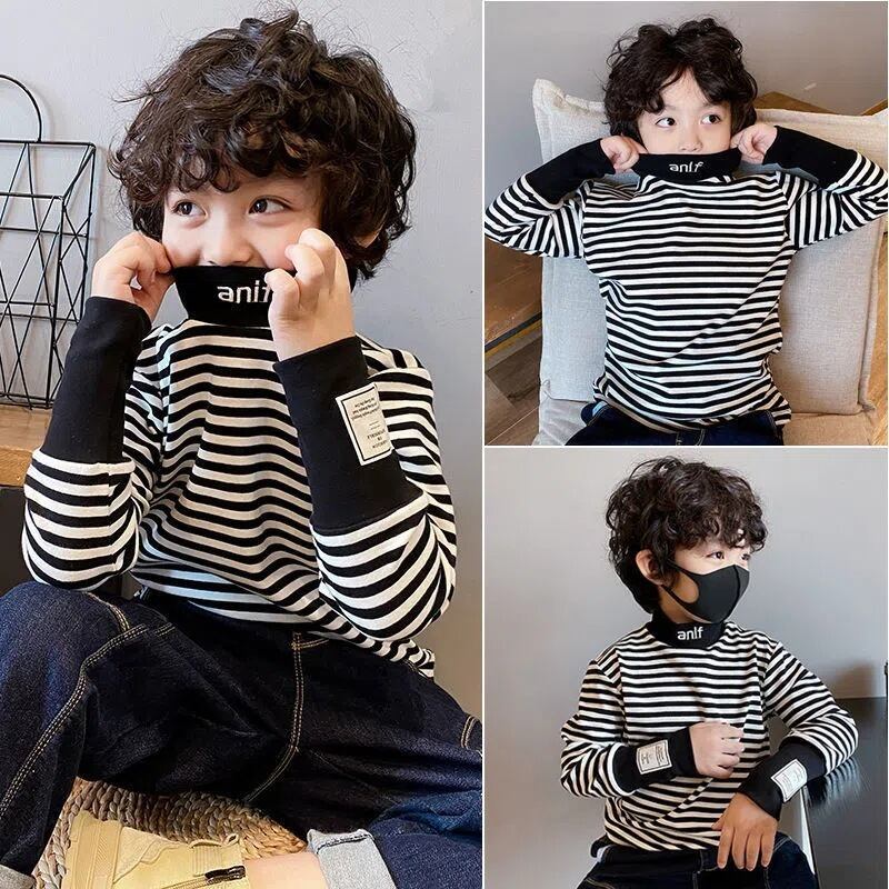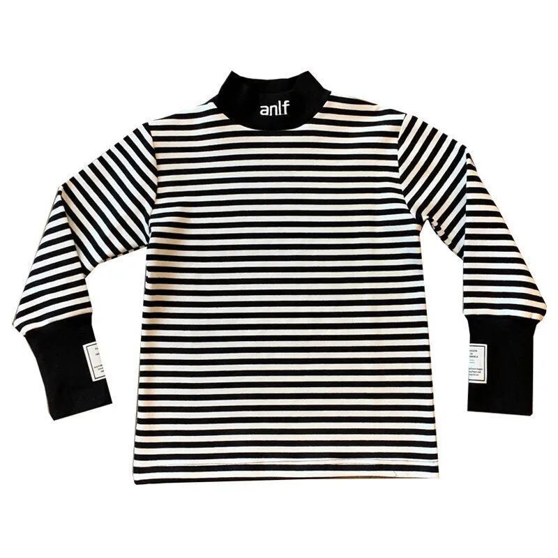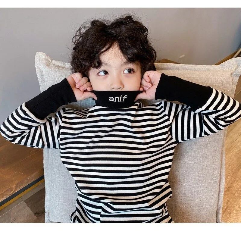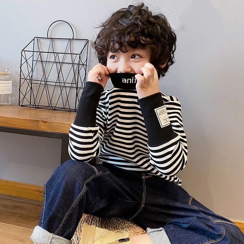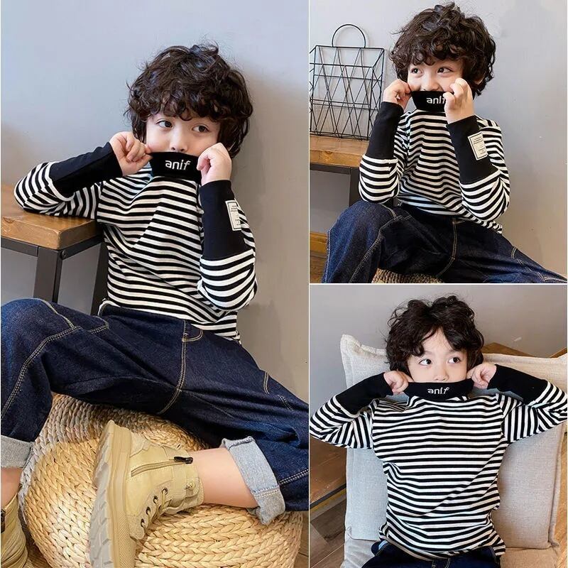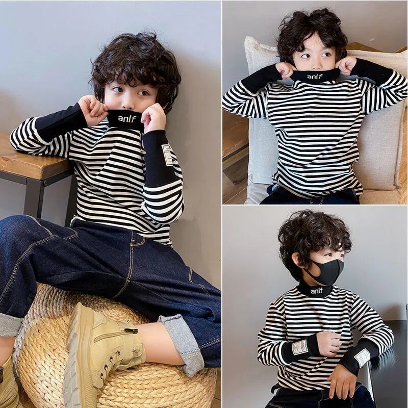 男の子女の子子供服 長袖 秋冬用Tシャツ ストライプベルベット