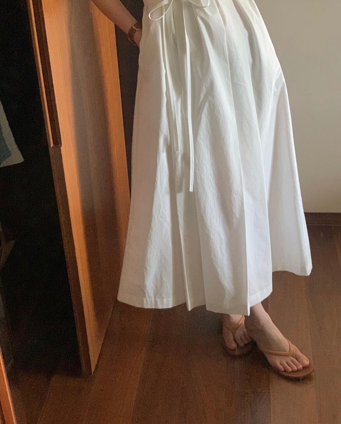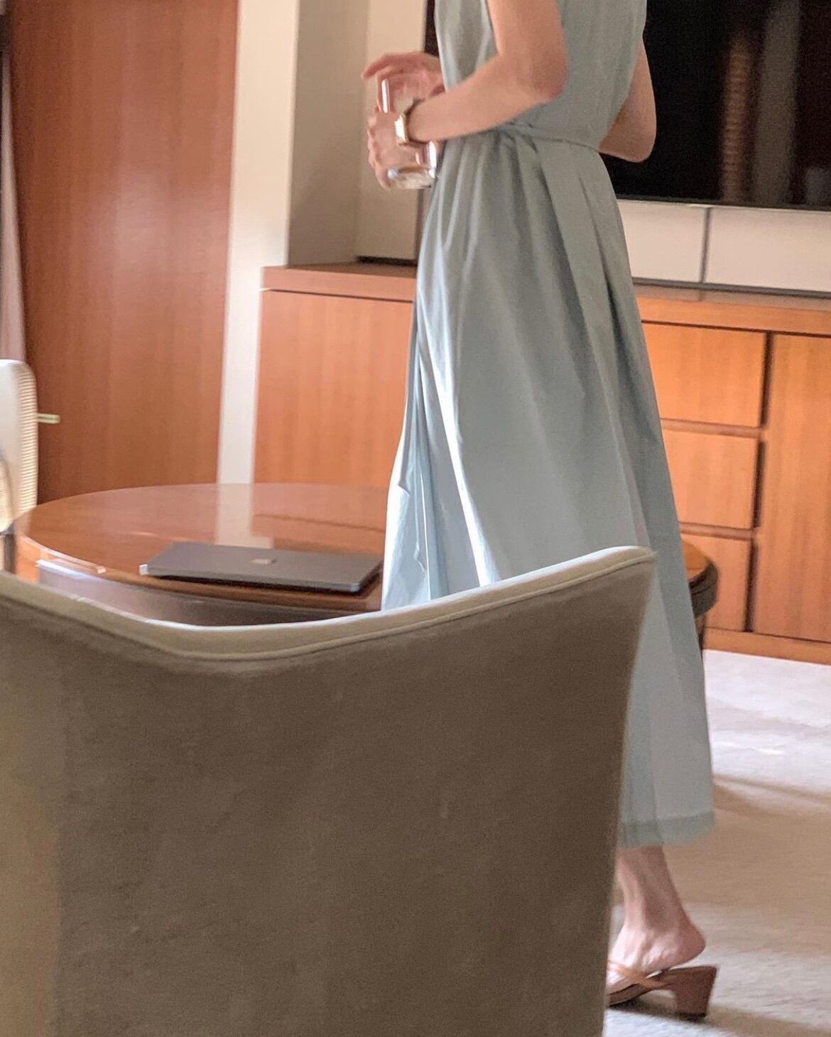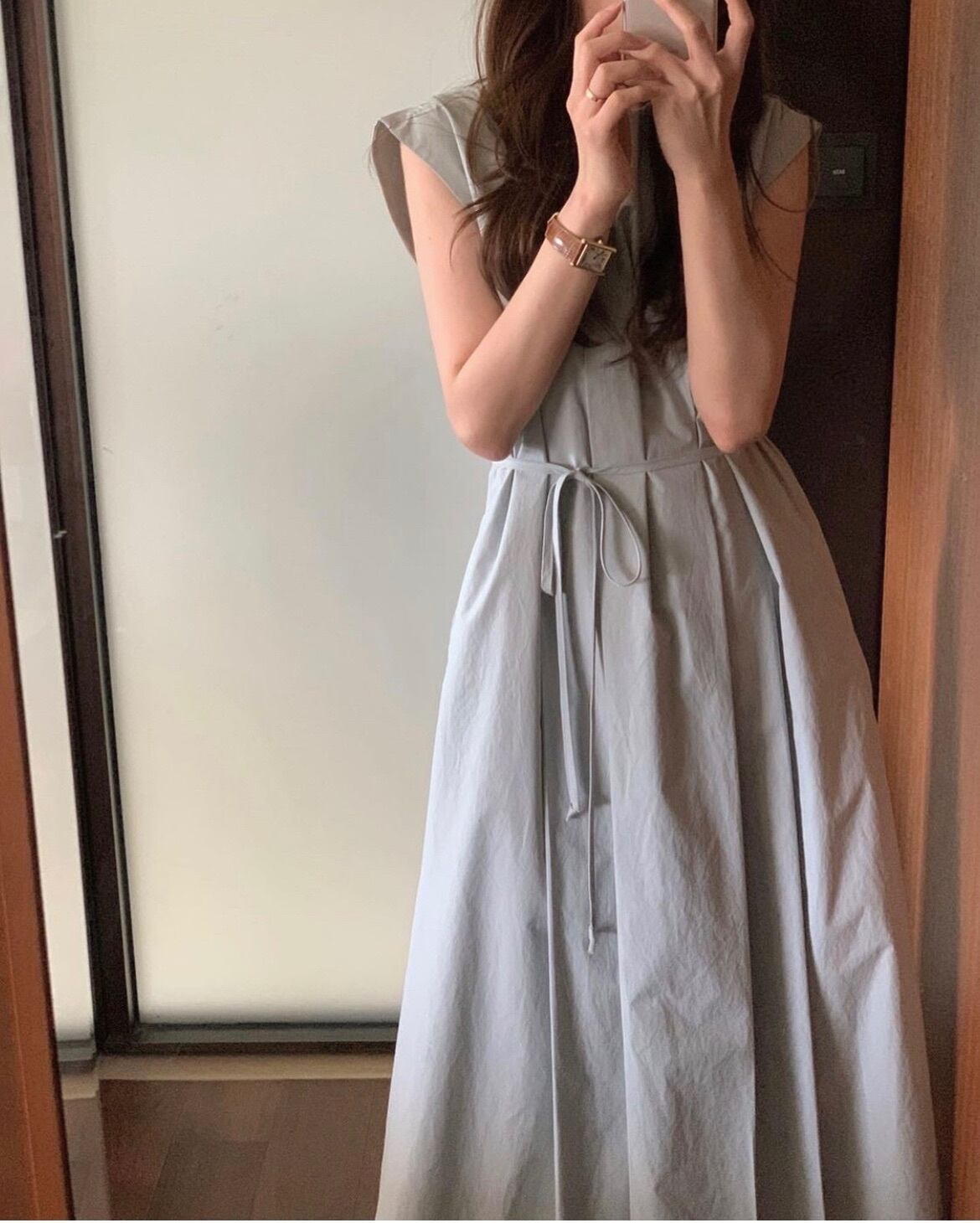 このワンピースは、身長を気にせずにお召しいただけるように、ロング丈設計となっています。ノースリーブなので、暑い季節でも快適に着用できるのも嬉しいポイントです。ウエスト部分にはキュッと絞りが入っているので、スタイルアップ効果も期待できます。