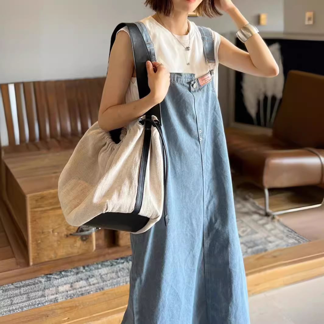 ロング丈ワンピースのデニムワンピースは、シンプルでありながらも着こなしの主役になるアイテムです。カジュアルなデニム素材が、大人の女性らしい洗練された印象を与えます。ノースリーブなので、春夏の季節にぴったり。さらに、キャミワンピースとしても着用可能な2wayデザインも魅力です。